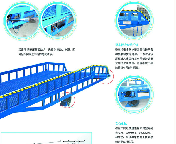 移動式登車橋是與叉車配合使用的貨物裝卸輔助設備,可根據貨車車廂的高低調節高度,叉車可以直接通過本設備駛入車廂內部進行貨物的批量裝卸,僅需單人作業,即可實現貨物的快速裝卸。它的菱形網狀結構,充分保證了卓越的防滑性能,使叉車有極好的爬坡性和可操縱性。即使在雨、雪天氣,仍能保證正常使用。它的可調節長度的索鏈能方便地鉤住貨車,使登車橋與貨車始終緊密貼合。采用手搖液壓泵作動力,不需外接動力電源即可輕松實現登車橋的高度調節。配置的剎車墊可有效防止貨車裝卸時登車橋移位。
